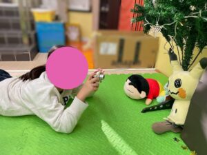 クリスマスの背景にぬいぐるみを自分でセッティングして写真を撮る